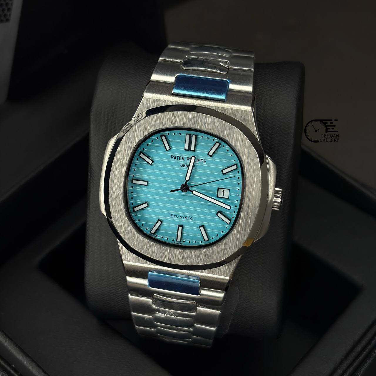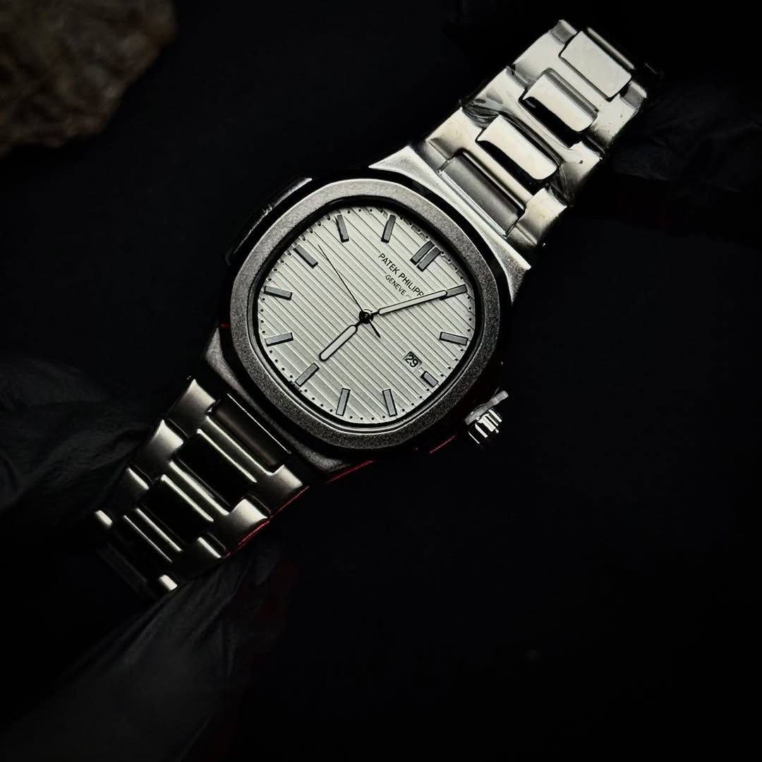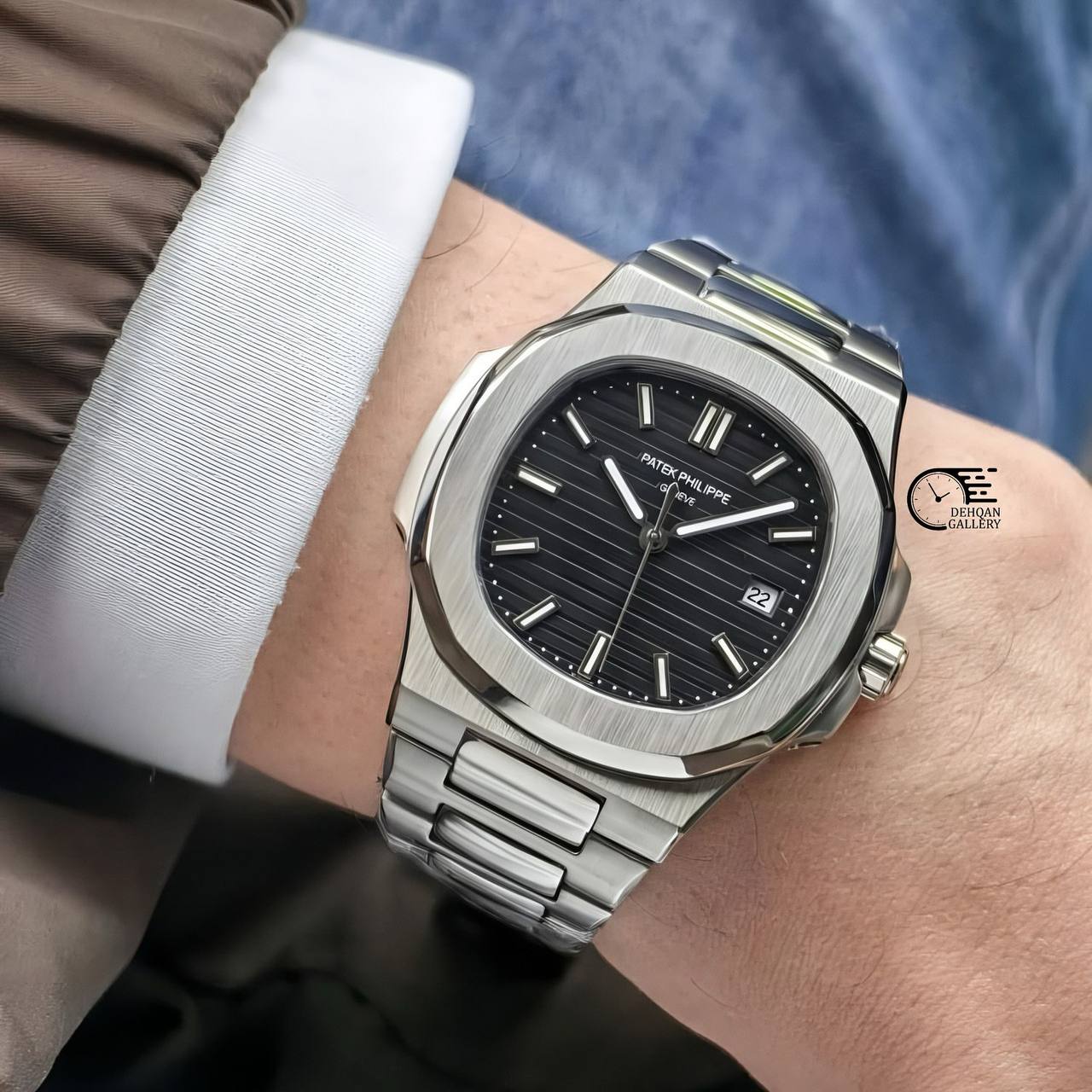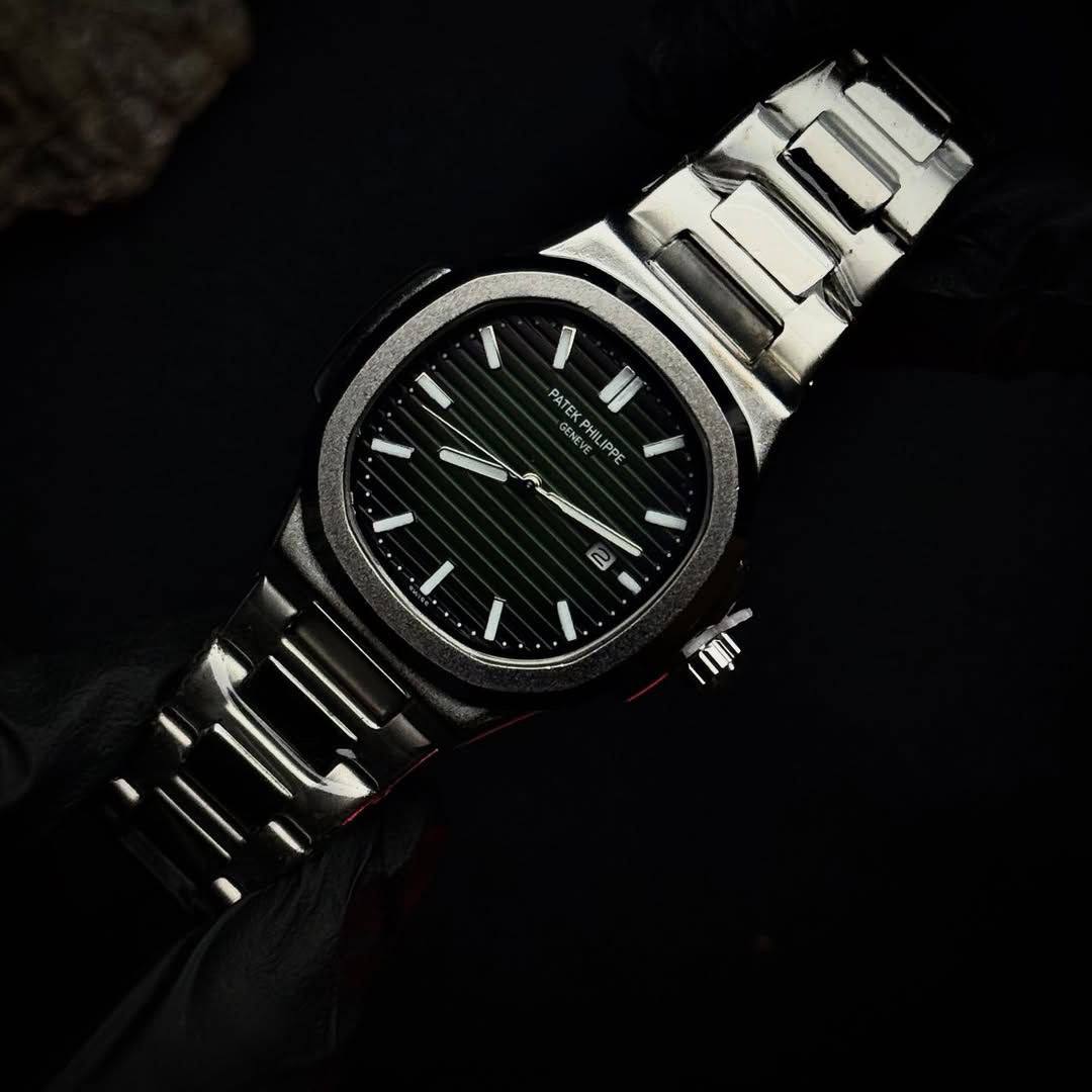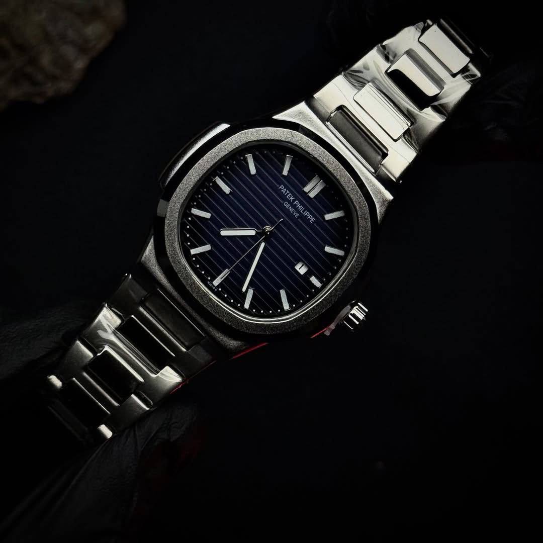 Patek Philippe Nautilus – Klassik Hashamat. Yangi, premium sifat. Zanglamaydigan po‘lat korpus va bilaguzuk. Qora siferblat, sana ko‘rsatgichi.